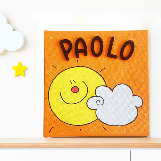 Quadro Personalizzato Buongiorno Dipinto a Mano – Quadrotto con Sole e Nuvoletta per Bambini